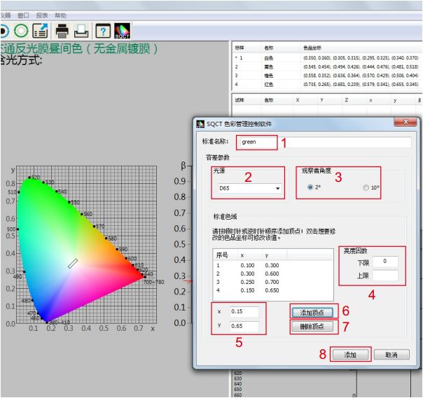 如圖5所示,在位置1處輸入標樣名稱,位置2處選擇光源種類(默認為D65),位置3處選擇觀察者角度(默認為2度),位置4處輸入亮度因數(除熒光物質外,普通反射樣品亮度因數大于0小于1,即0<β<1)。在位置5處輸入色品坐標點,然后點擊“添加頂點”按鈕,則新輸入的色品坐標點出現在標準色域框內,重復上述步驟,依次輸入各色品坐標點;對于輸入錯誤的色品坐標點,先在標準色域框內選中,然后點擊“刪除頂點”按鈕,則刪掉該頂點。全部輸入完畢,點擊位置8處“添加”按鈕,則完成“多邊形-容差標樣”建立。
