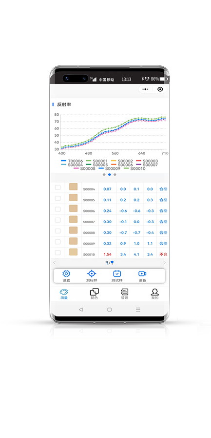 ●一鍵測量,便知配方,重復性△E*ab在0.05以內(nèi),約1s測量,可過計量