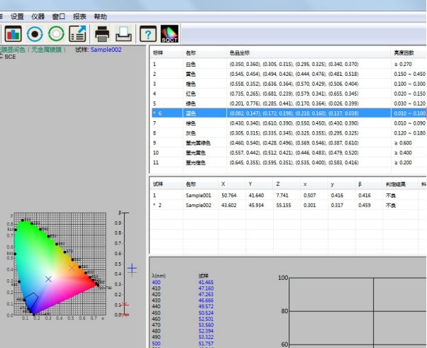 譬如如何判定藍色試樣是否在《GB/T18833-2012道路交通反光膜樣》所規定的藍色區域內(無金屬鍍層,晝間反光膜顏色),按照下面的步驟,將依次完成測量和判定。
