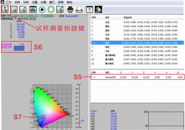 將測試樣品放在NS808測量口徑上,貼緊,鼠標點擊試樣測試快捷工具,如圖13所示。大約1.5秒時間,完成測試,測試數據如圖13中S5所示,在色品坐圖中的位置如S7所示,仿真及判定結果如S6部分所示。
