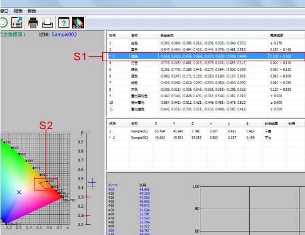 雙擊標樣區域的藍色,如圖12中是S3所示部分,使藍色為當前標樣,藍色多邊形-容差標樣(《GB/T18833-2012道路交通反光膜樣》規定的藍色區域)則顯示在S4部分。