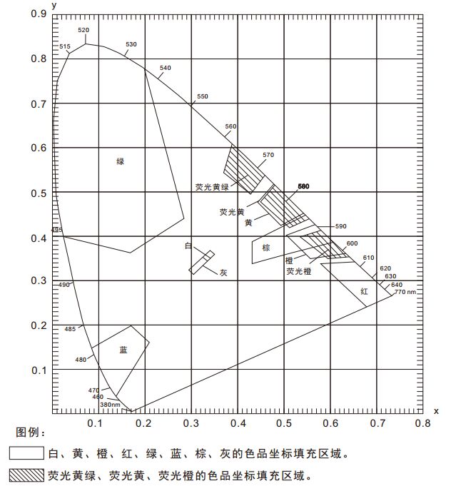 在《GB2893安全色》、《GB/T18833道路交通反光膜》等相關標準中,通常給出一塊顏色區域(多個色品坐標點)和亮度因數要求,在D65/A光源和45/0幾何條件下,判定樣品是否落在對應的顏色區域內,借此判定樣品是否滿足標準規定的色度要求。由于顏色區域為多邊形,如下圖所示,導致使用普通的分光測色儀無法完成判定。NS808測色儀配合SQCT軟件的交通路標測量模塊則可以輕松解決這方面的問題。